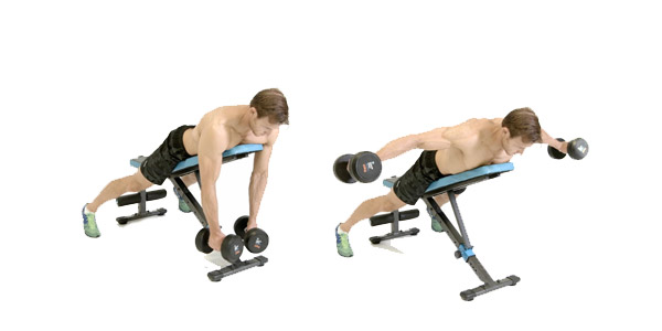 Lie down on an incline bench with the chest and stomach pressing against the incline. Have the dumbbells in each hand with the palms facing each other (neutral grip).
