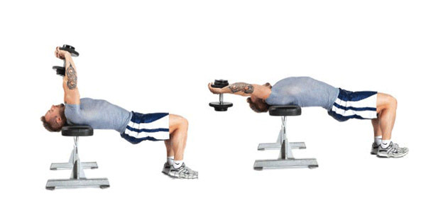 While keeping your arms straight, lower the weight slowly in an arc behind your head while breathing in until you feel a stretch on the chest.